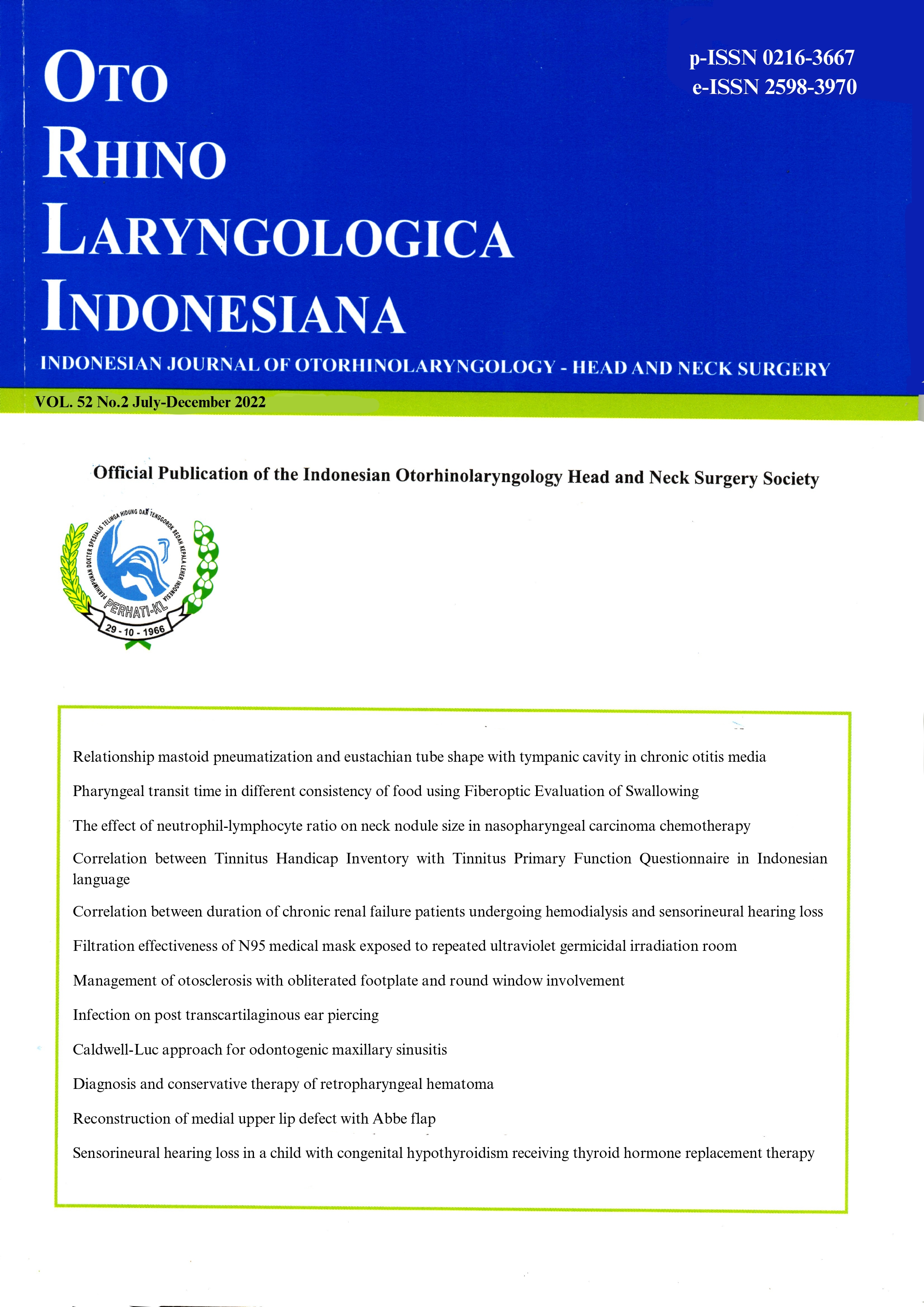 Latar belakang: Pandemi Coronavirus disease 2019 (COVID-19) menyebabkan keterbatasan tersedianya alat pelindung diri (APD) termasuk masker respirator N95. Ultraviolet Germicidal Irradiation (UVGI) merupakan salah satu cara desinfeksi yang menjanjikan dan efektif, sehingga masker N95 dapat digunakan kembali. Bilik UVGI merupakan metode yang efektif dalam disinfeksi terhadap SARS-CoV-2, namun efek paparan UVGI terhadap kemampuan filtrasi masker N95 belum diketahui. Tujuan: Untuk mengevaluasi efektivitas filtrasi masker N95 setelah paparan UV-C berulang di Bilik UVGI. Metode: Penelitian ini adalah studi ekperimental dua kelompok paralel untuk melihat efek paparan UVGI berulang terhadap filtrasi 2 tipe masker N95 (tipe 8210 dan 1860) sebanyak 25 masker di setiap grup, menggunakan aerosol particle counter setelah paparan UVGI berulang sebanyak 10 siklus di Bilik UVGI Departemen THT-KL RSCM. Hasil: Tidak didapatkan perbedaan bermakna pada masker N95 pasca-paparan UVGI berulang sebanyak 10 siklus dengan rerata filtrasi pada 2 tipe masker, serta tidak terdapat perubahan signifikan kemampuan filtrasi masker N95 pasca-paparan UVGI berulang. Kesimpulan: Filtrasi masker N95 pada penelitian ini dapat dipertahankan 95% pasca-paparan UVGI berulang hingga dosis kumulatif 10.126˗16.200 mJ/cm2 di bilik UVGI Departemen THT-KL RSCM.